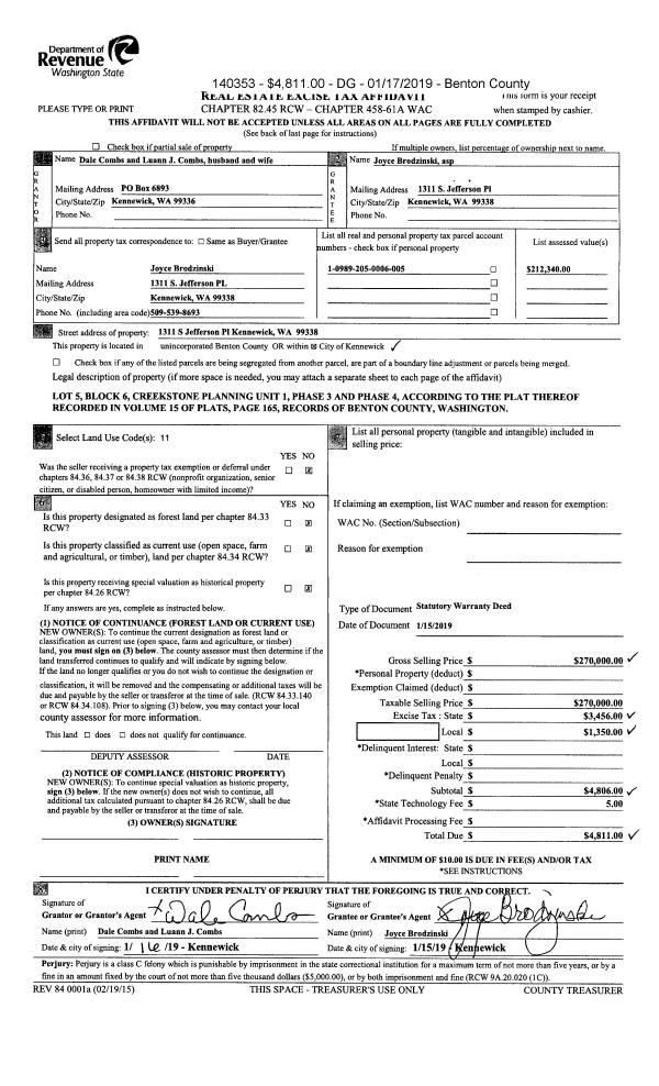 | 2 | 01/15/2019 | SWD | Statutory Warranty Deed | COMBS DALE & LUANN J | BRODZINSKI JOYCE | 2019-001440 | | $270,000.00 | 140353 | |