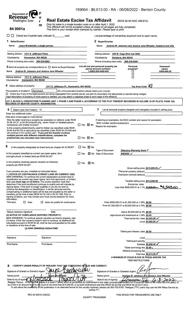 | 1 | 06/06/2022 | SWD | Statutory Warranty Deed | BRODZINSKI JOYCE | JAMESON ANDREW M & WHEELER JESSICA JANE | 2022-019258 | | $413,000.00 | 169664 | |