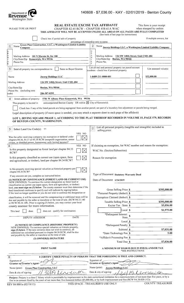 | 2 | 01/24/2019 | SWD | Statutory Warranty Deed | GREEN PLAN CONSTRUCTION LLC | JOCORP HOLDINGS LLC | 2019-002725 | | $395,000.00 | 140608 | |
