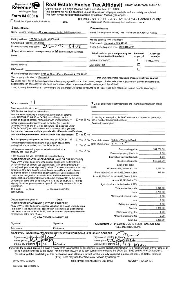 | 1 | 02/01/2024 | SWD | Statutory Warranty Deed | JOCORP HOLDINGS LLC | WADE TRUSTEE CHRISTOPHER B | 2024-002245 | | $552,000.00 | 180393 | |