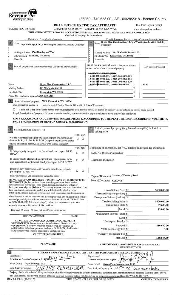 | 2 | 06/25/2018 | SWD | Statutory Warranty Deed | JAYA HOLDINGS LLC | GREEN PLAN CONSTRUCTION LLC | 2018-018926 | | $600,000.00 | 136050 | |