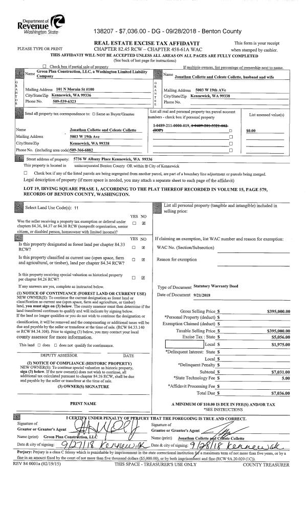 | 1 | 09/21/2018 | SWD | Statutory Warranty Deed | GREEN PLAN CONSTRUCTION LLC | COLLETTE JONATHAN & CELESTE | 2018-029041 | | $395,000.00 | 138207 | |