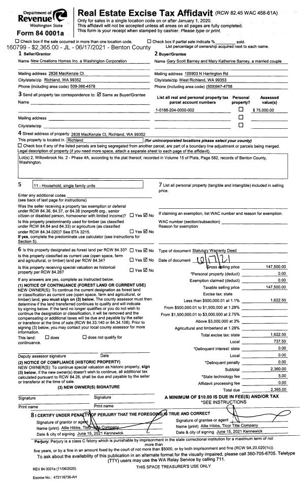 | 2 | 06/17/2021 | SWD | Statutory Warranty Deed | NEW CREATION HOMES INC | BARNEY GARY SCOTT & MARY KATHERINE | 2021-028805 | | $147,500.00 | 160799 | |