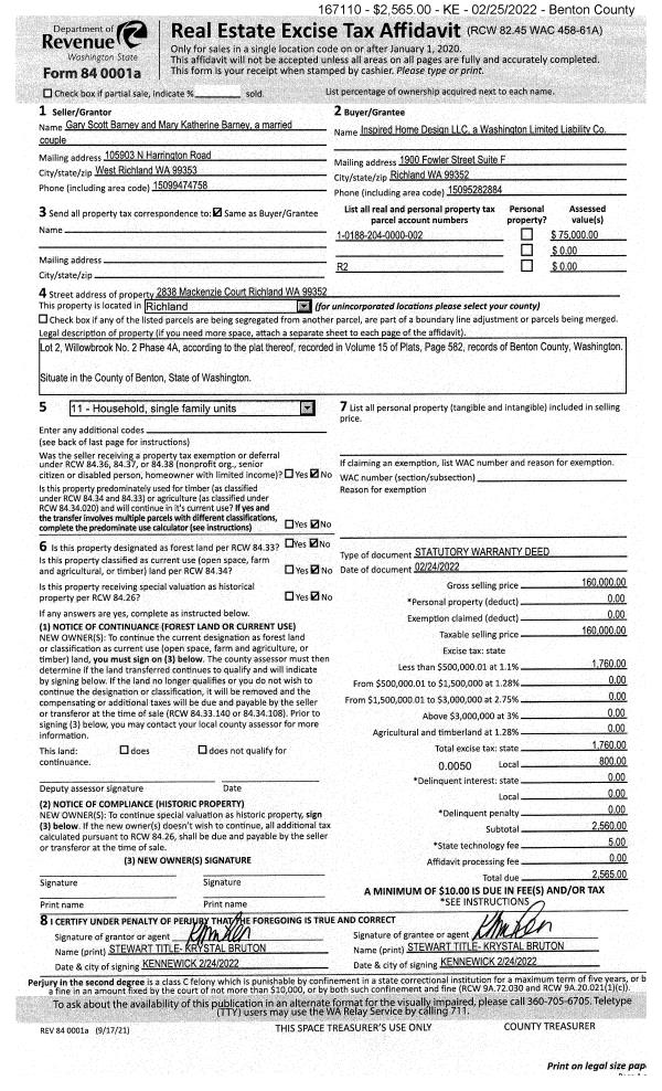 | 1 | 02/24/2022 | SWD | Statutory Warranty Deed | BARNEY GARY SCOTT & MARY KATHERINE | INSPIRED HOME DESIGN LLC | 2022-006710 | | $160,000.00 | 167110 | |