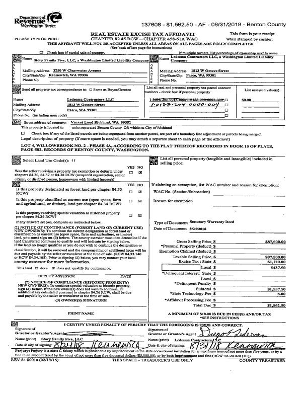 | 1 | 08/24/2018 | SWD | Statutory Warranty Deed | STORY FAMILY FIVE LLC | LEDESMA CONTRACTORS LLC | 2018-026052 | | $87,500.00 | 137608 | |