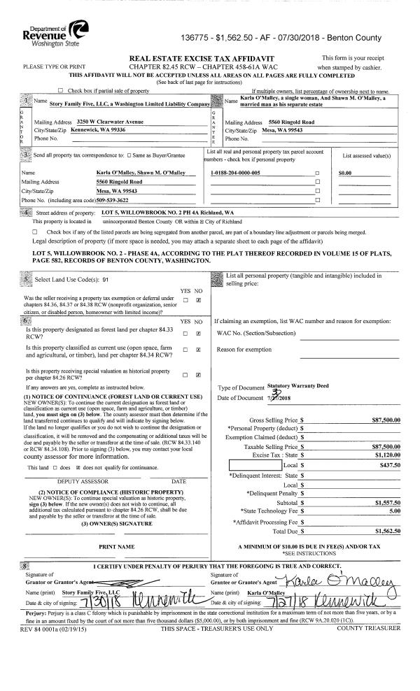 | 1 | 07/30/2018 | SWD | Statutory Warranty Deed | STORY FAMILY FIVE LLC | O'MALLEY KARLA & O'MALLEY SHAWN M | 2018-022390 | | $87,500.00 | 136775 | |