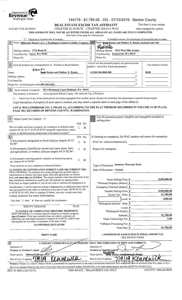 | 2 | 07/09/2019 | SWD | Statutory Warranty Deed | MILLENNIAL HOMES LLC | RUELAS RODOLFO & MALLORY E | 2019-018862 | | $100,000.00 | 144179 | |