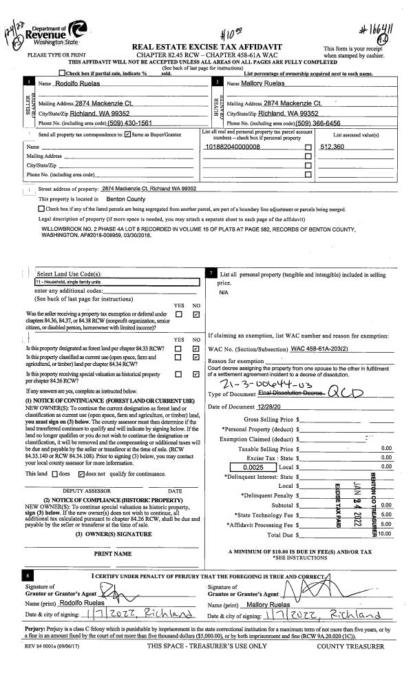 | 1 | 12/28/2020 | QCD | Quit Claim Deed | RUELAS RODOLFO & MALLORY E | RUELAS MALLORY | 2022-002738 | | $0.00 | 166411 | |