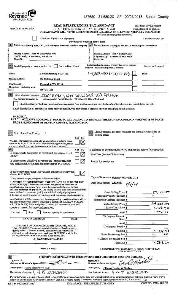 | 2 | 09/04/2018 | SWD | Statutory Warranty Deed | STORY FAMILY FIVE LLC | CHINOOK HEATING & AIR INC | 2018-026312 | | $89,000.00 | 137659 | |