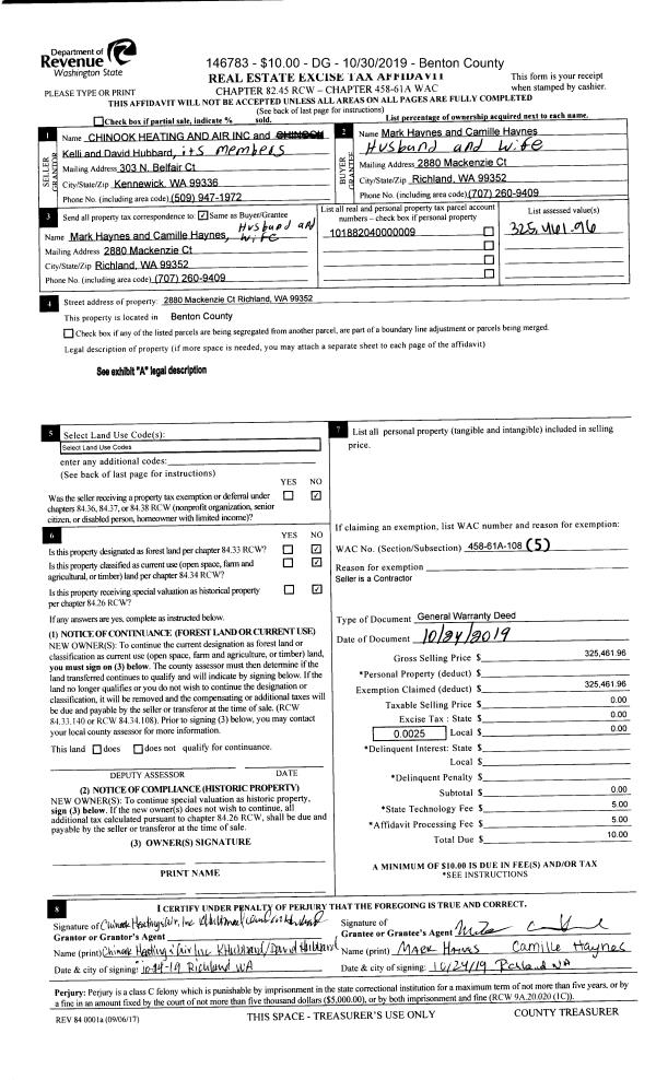 | 1 | 10/24/2019 | WD | Warranty Deed | CHINOOK HEATING & AIR INC | HAYNES MARK & CAMILLE | 2019-033977 | | $325,462.00 | 146783 | |