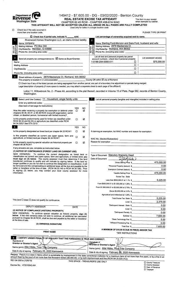 | 1 | 02/26/2020 | SWD | Statutory Warranty Deed | RIVERWOOD HOMES WASHINGTON LLC | FORD-MONZON STERLING & FORD SARA | 2020-007473 | | $475,000.00 | 149412 | |
