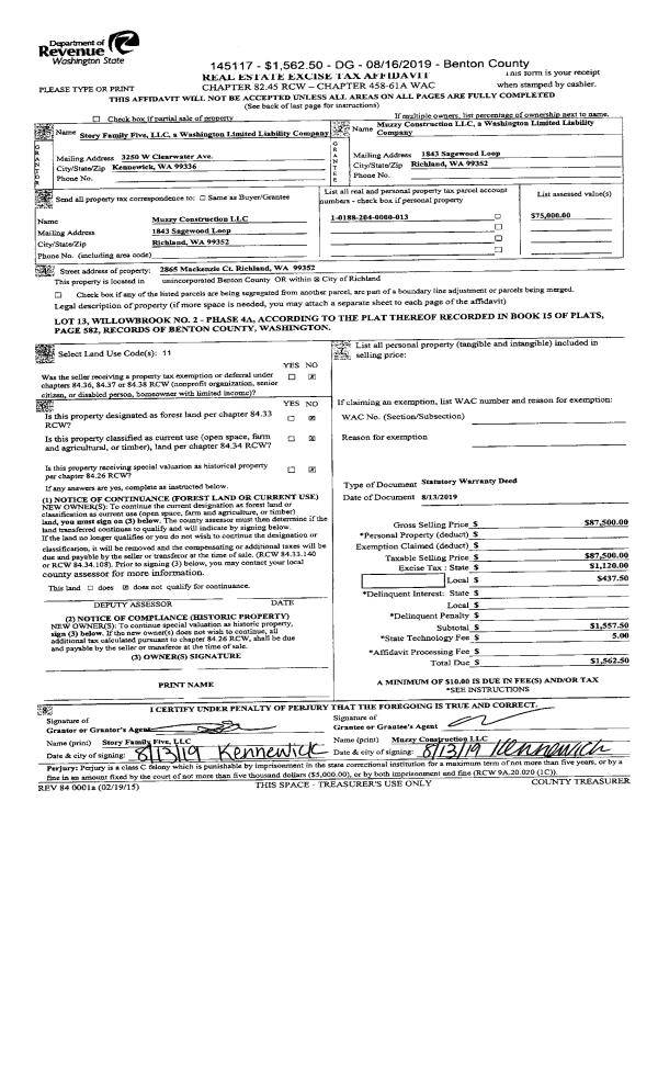 | 2 | 08/13/2019 | SWD | Statutory Warranty Deed | STORY FAMILY FIVE LLC | MUZZY CONSTRUCTION LLC | 2019-023956 | | $87,500.00 | 145117 | |