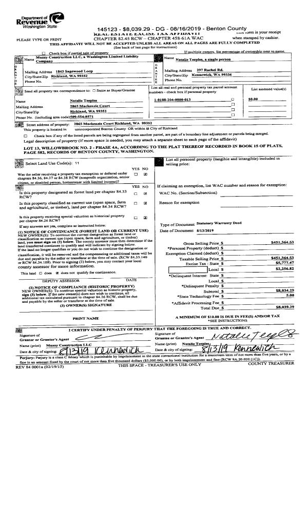 | 1 | 08/13/2019 | SWD | Statutory Warranty Deed | MUZZY CONSTRUCTION LLC | TEEPLES NATALIE | 2019-023957 | | $451,365.00 | 145123 | |