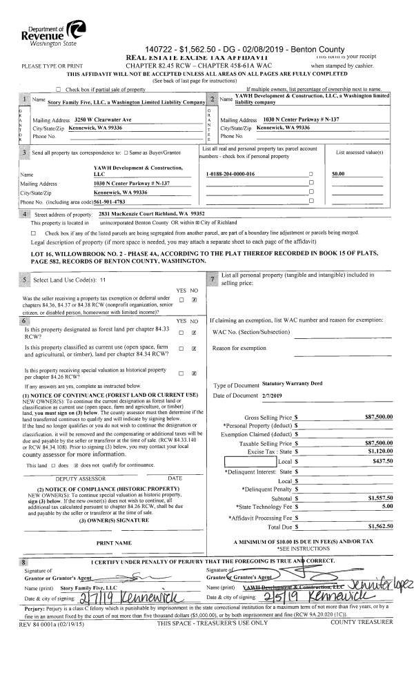 | 2 | 02/07/2019 | SWD | Statutory Warranty Deed | STORY FAMILY FIVE LLC | YAWH DEVELOPMENT & CONSTRUCTION LLC | 2019-003222 | | $87,500.00 | 140722 | |