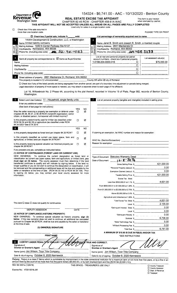 | 1 | 10/08/2020 | SWD | Statutory Warranty Deed | YAWH DEVELOPMENT & CONSTRUCTION LLC | SMITH JANEL B & JOSEPH R | 2020-039844 | | $421,000.00 | 154324 | |
