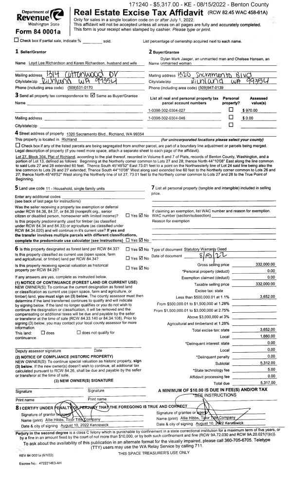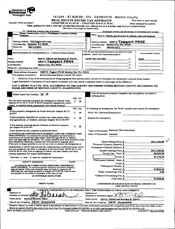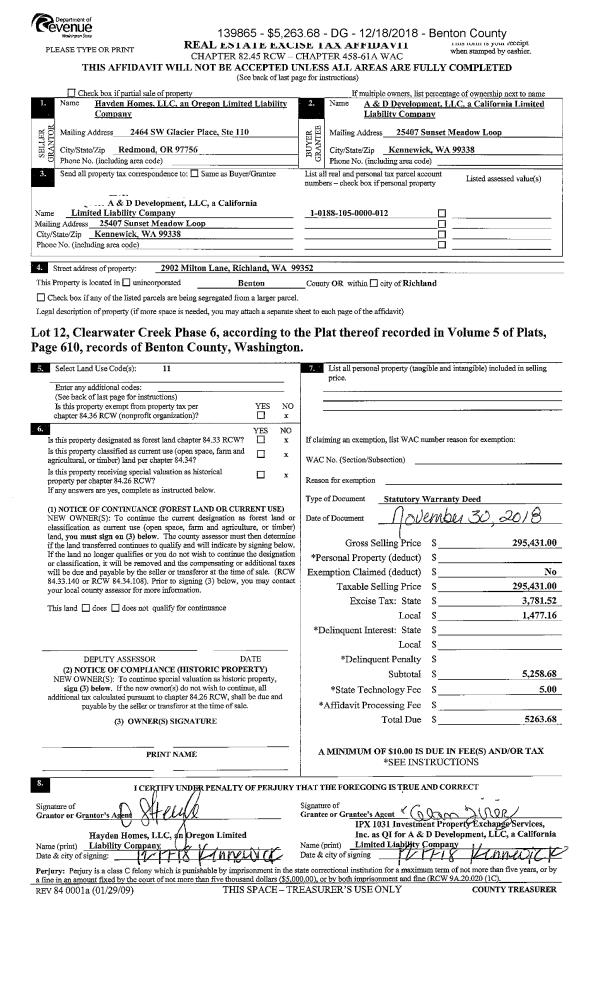 | 5 | 09/14/2018 | SWD | Statutory Warranty Deed | RICHLAND 132 LLC | HAYDEN HOMES LLC | 2018-027593 | | $820,500.00 | 137893 | |
