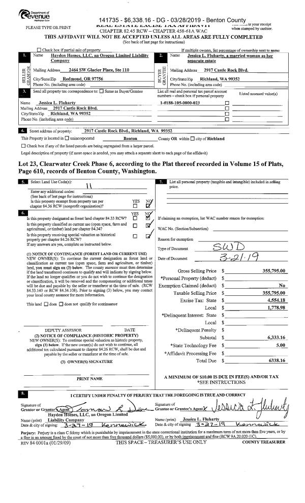 | 3 | 03/21/2019 | SWD | Statutory Warranty Deed | HAYDEN HOMES LLC | FLUHARTY JESSICA L | 2019-007490 | | $355,795.00 | 141735 | |
