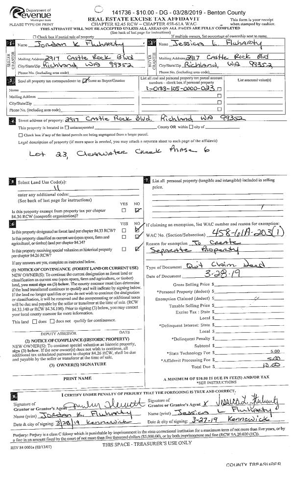 | 2 | 03/28/2019 | QCD | Quit Claim Deed | FLUHARTY JORDAN K | FLUHARTY JESSICA L | 2019-007491 | | $0.00 | 141736 | |