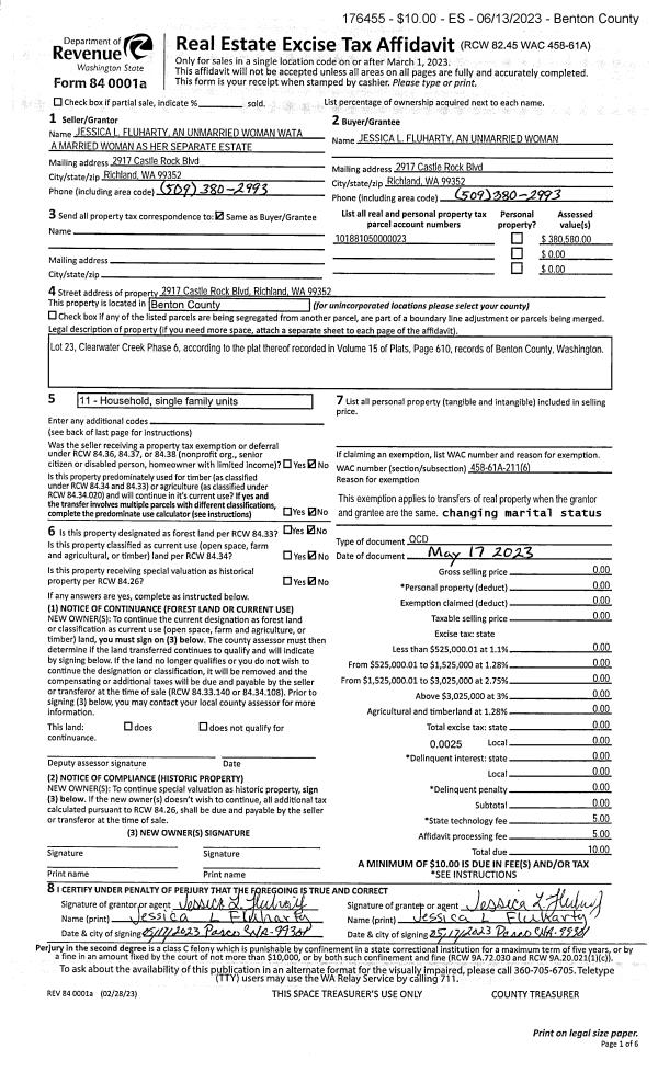 | 1 | 05/17/2023 | QCD | Quit Claim Deed | FLUHARTY JESSICA L | FLUHARTY JESSICA L | | | $0.00 | 176455 | |