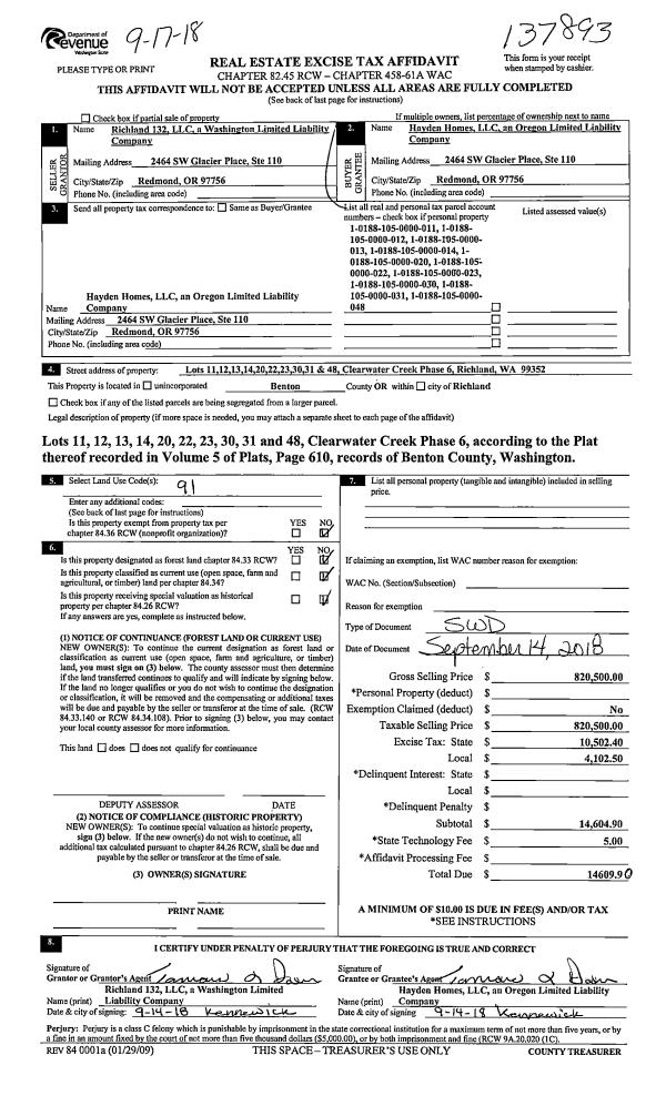 | 4 | 09/14/2018 | SWD | Statutory Warranty Deed | RICHLAND 132 LLC | HAYDEN HOMES LLC | 2018-027593 | | $820,500.00 | 137893 | |