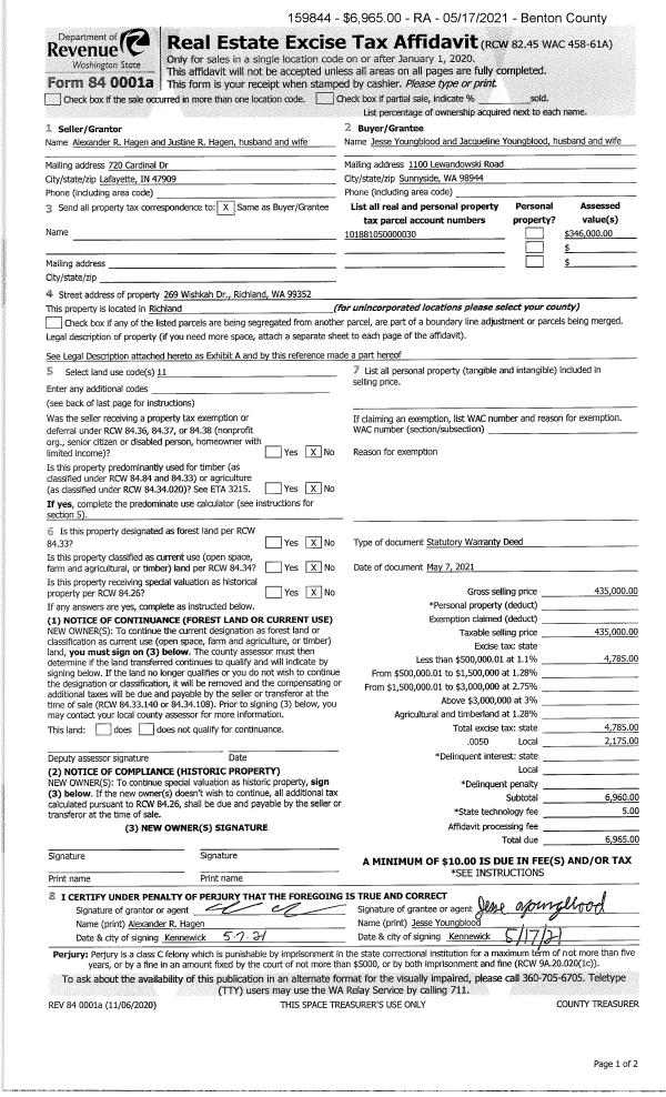 | 1 | 05/07/2021 | SWD | Statutory Warranty Deed | HAGEN ALEXANDER R & JUSTINE R | YOUNGBLOOD JESSE & JACQUELINE | 2021-023662 | | $435,000.00 | 159844 | |