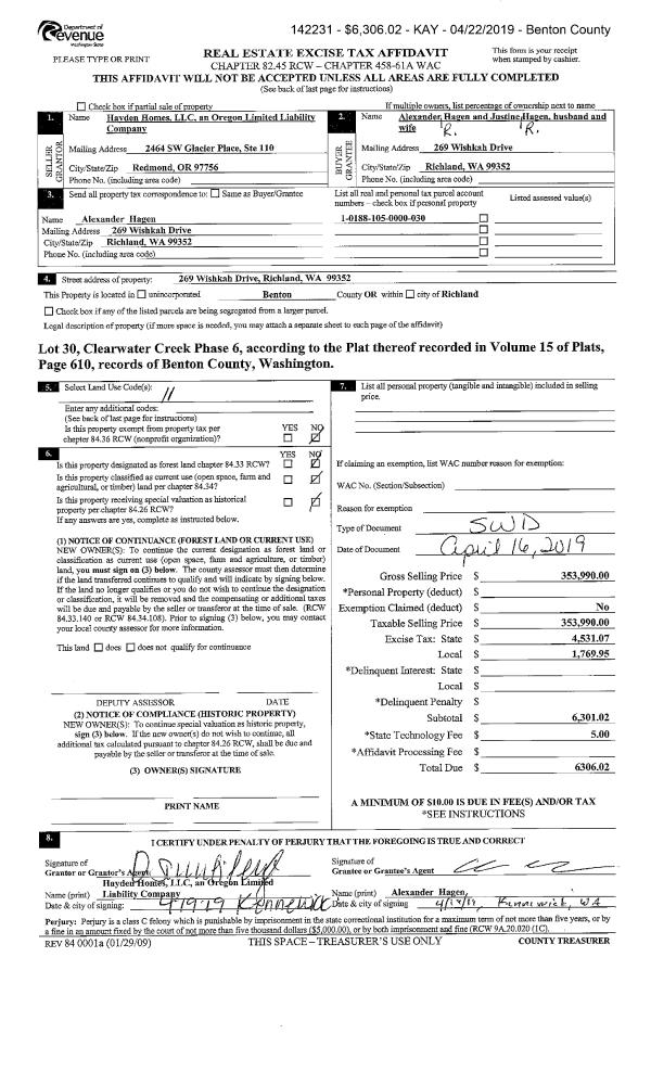 | 2 | 04/16/2019 | SWD | Statutory Warranty Deed | HAYDEN HOMES LLC | HAGEN ALEXANDER R & JUSTINE R | 2019-009869 | | $353,990.00 | 142231 | |