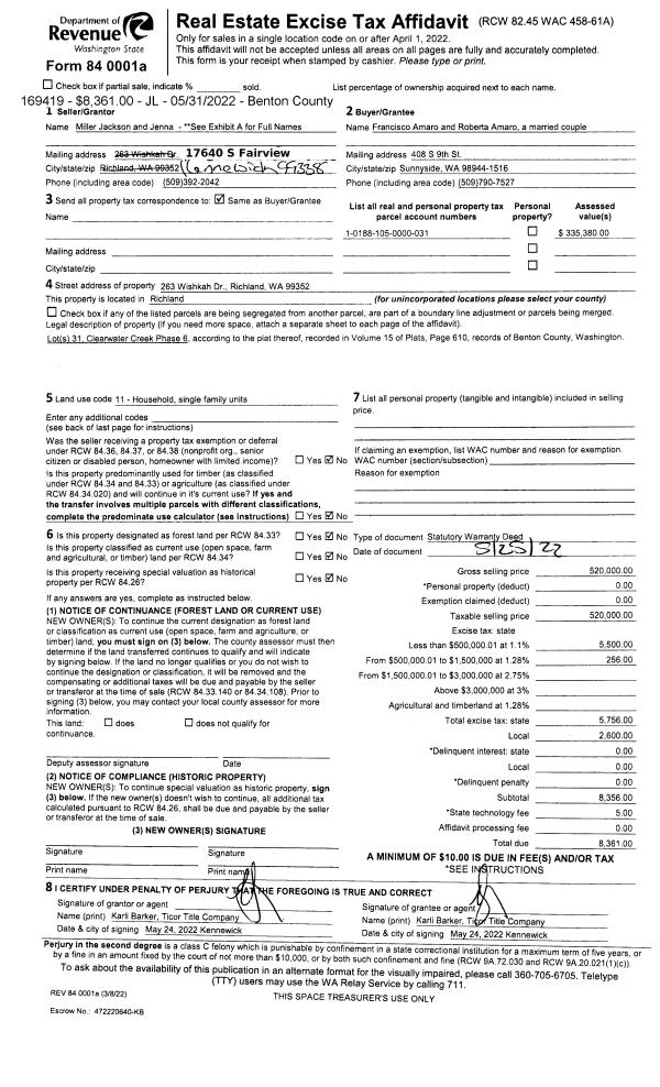 | 1 | 05/25/2022 | SWD | Statutory Warranty Deed | JACKSON MILLER & DAMBERG JENNA | AMARO FRANCISCO & ROBERTA | 2022-018216 | | $520,000.00 | 169419 | |