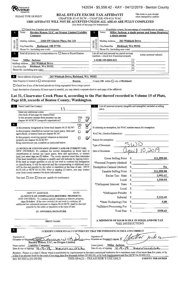 | 2 | 04/10/2019 | SWD | Statutory Warranty Deed | HAYDEN HOMES LLC | JACKSON MILLER & DAMBERG JENNA | 2019-009053 | | $311,990.00 | 142034 | |