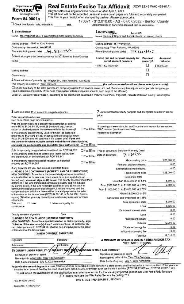 | 1 | 07/01/2022 | SWD | Statutory Warranty Deed | MS PROPERTIES LLC | KOPHS STANLEY JOHN & JUDY CAMILLE | 2022-022648 | | $725,000.00 | 170371 | |