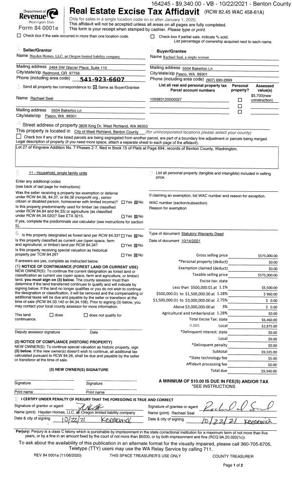 | 2 | 10/14/2021 | SWD | Statutory Warranty Deed | HAYDEN HOMES LLC | SEAL RACHAEL | 2021-048786 | | $575,000.00 | 164245 | |