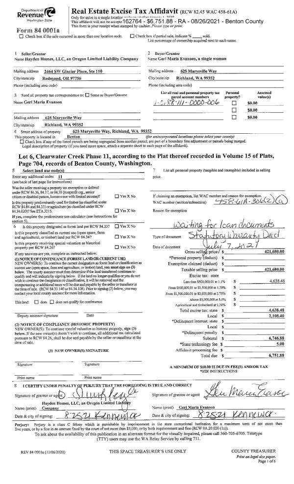 RICHLAND, WA 99352 | CLEARWATER CREEK PHASE 11, LOT 23. RECORDED IN VOLUME 15 OF PLATS AT PAGE 0704, RECORDS OF BENTON COUNTY, WASHINGTON. AF#2021-008404, 2/19/2021 |