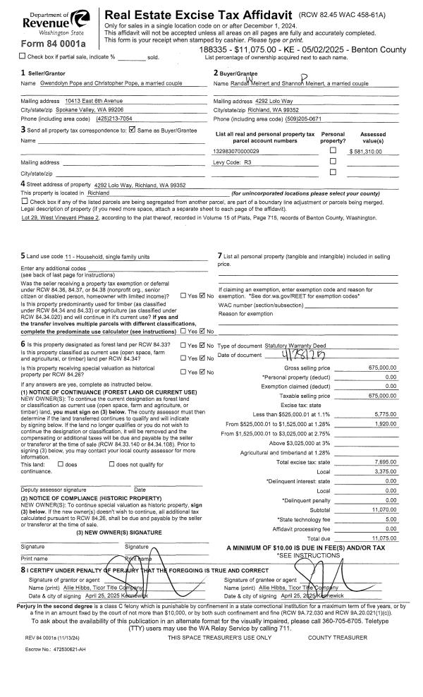 | 1 | 04/28/2025 | SWD | Statutory Warranty Deed | POPE GWENDOLYN & CHRISTOPHER | MEINERT RANDALL W & SHANNON P | 2025-009623 | | $675,000.00 | 188335 | |