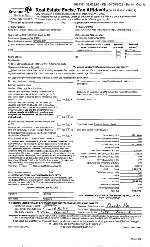 | 2 | 03/31/2022 | SWD | Statutory Warranty Deed | NEW TRADITION HOMES INC | POPE GWENDOLYN & CHRISTOPHER | 2022-012046 | | $593,144.00 | 168137 | |