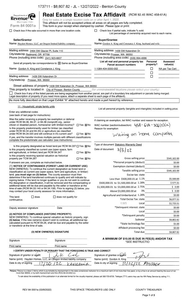 PROSSER, WA 99350 | BELLA VISTA PHASE 2, LOT 43. RECORDED IN VOLUME 15 OF PLATS AT PAGE 733, RECORDS OF BENTON COUNTY, WASHINGTON. AF#2022-011327, 04/01/2022 |