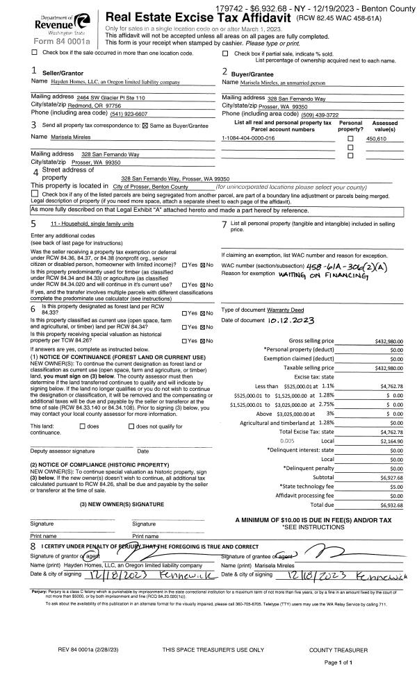 PROSSER, WA 99350 | BELLA VISTA PHASE 2, LOT 18. RECORDED IN VOLUME 15 OF PLATS AT PAGE 733, RECORDS OF BENTON COUNTY, WASHINGTON. AF#2022-011327, 04/01/2022 |