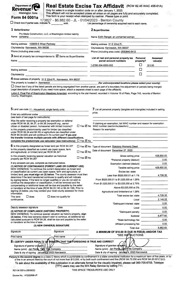 KENNEWICK, WA 99337 | WASHINGTON MEADOWS AMENDED, LOT 11. RECORDED IN VOLUME 15 OF PLATS AT PAGE 743, RECORDS OF BENTON COUNTY, WASHINGTON. AF#2022-021221, 06/24/2022 |