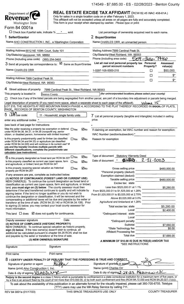 WEST RICHLAND, WA 99353 | THE HEIGHTS AT RED MOUNTAIN RANCH PHASE 4, LOT 223. RECORDED IN VOLUME 15 OF PLATS AT PAGE 739, RECORDS OF BENTON COUNTY, WASHINGTON. AF#2022-016564, 05/17/2022 |