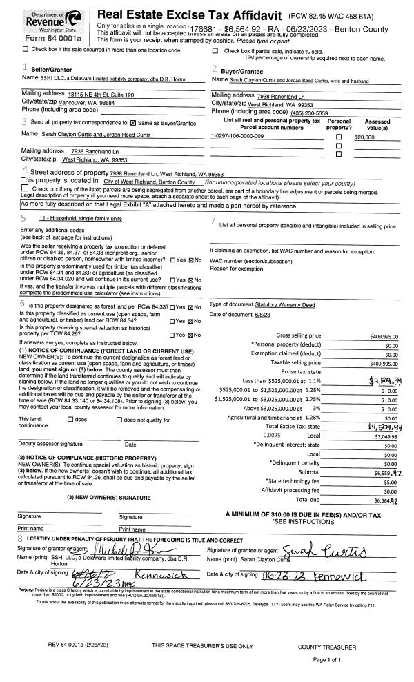 WEST RICHLAND, WA 99353 | RANCHLAND TOWNHOMES PLAT, LOT 20. RECORDED IN VOLUME 15 OF PLATS AT PAGE 744, RECORDS OF BENTON COUNTY, WASHINGTON. AF#2022-022893, 07/08/2022. |