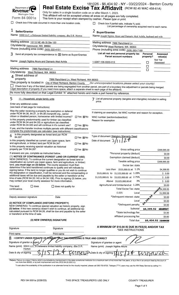 WEST RICHLAND, WA 99353 | RANCHLAND TOWNHOMES PLAT, LOT 32. RECORDED IN VOLUME 15 OF PLATS AT PAGE 744, RECORDS OF BENTON COUNTY, WASHINGTON. AF#2022-022893, 07/08/2022. |