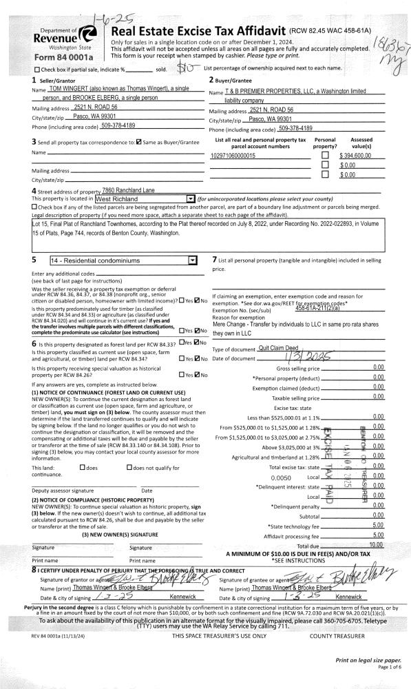 WEST RICHLAND, WA 99353 | RANCHLAND TOWNHOMES PLAT, LOT 6. RECORDED IN VOLUME 15 OF PLATS AT PAGE 744, RECORDS OF BENTON COUNTY, WASHINGTON. AF#2022-022893, 07/08/2022. |