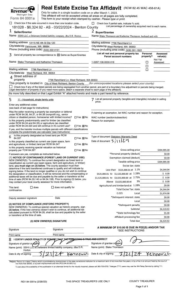 WEST RICHLAND, WA 99353 | RANCHLAND TOWNHOMES PLAT, LOT 28. RECORDED IN VOLUME 15 OF PLATS AT PAGE 744, RECORDS OF BENTON COUNTY, WASHINGTON. AF#2022-022893, 07/08/2022. |
