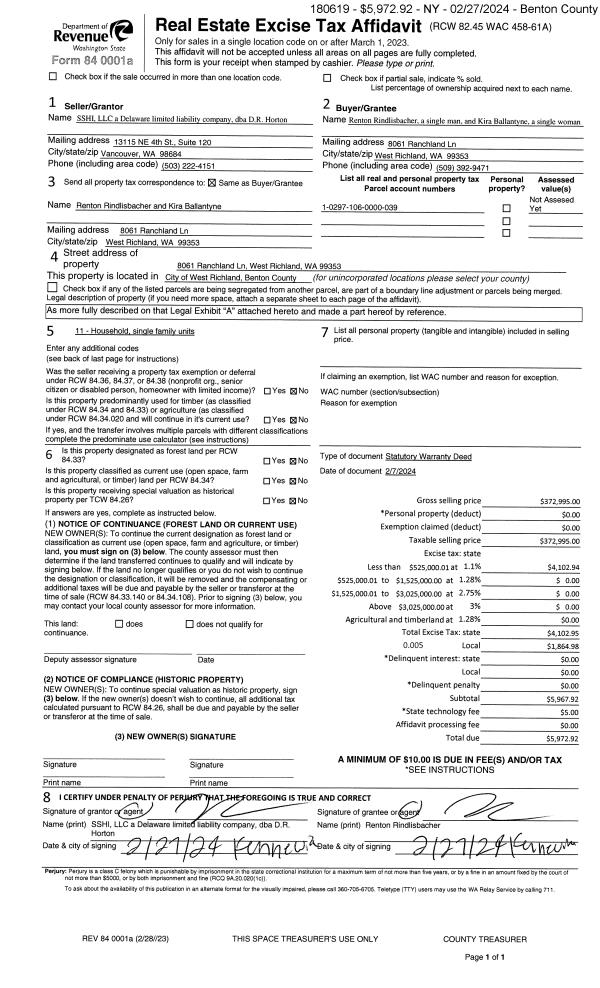 WEST RICHLAND, WA 99353 | RANCHLAND TOWNHOMES PLAT, LOT 18. RECORDED IN VOLUME 15 OF PLATS AT PAGE 744, RECORDS OF BENTON COUNTY, WASHINGTON. AF#2022-022893, 07/08/2022. |