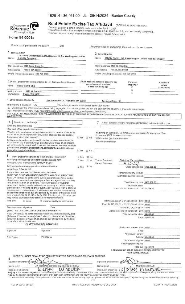 RICHLAND, WA 99352 | WELLHOUSE HEIGHTS, LOT 8. RECORDED IN VOLUME 15 OF PLATS AT PAGE 751, RECORDS OF BENTON COUNTY, WASHINGTON. AF#2022-033615, 10/20/2022. |