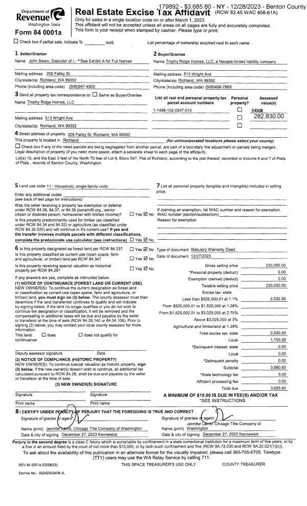 | 2 | 12/27/2023 | SWD | Statutory Warranty Deed | DU VON DONALD L & ET UX | TROPHY RIDGE HOMES LLC | 2023-027081 | | $230,050.00 | 179892 | |