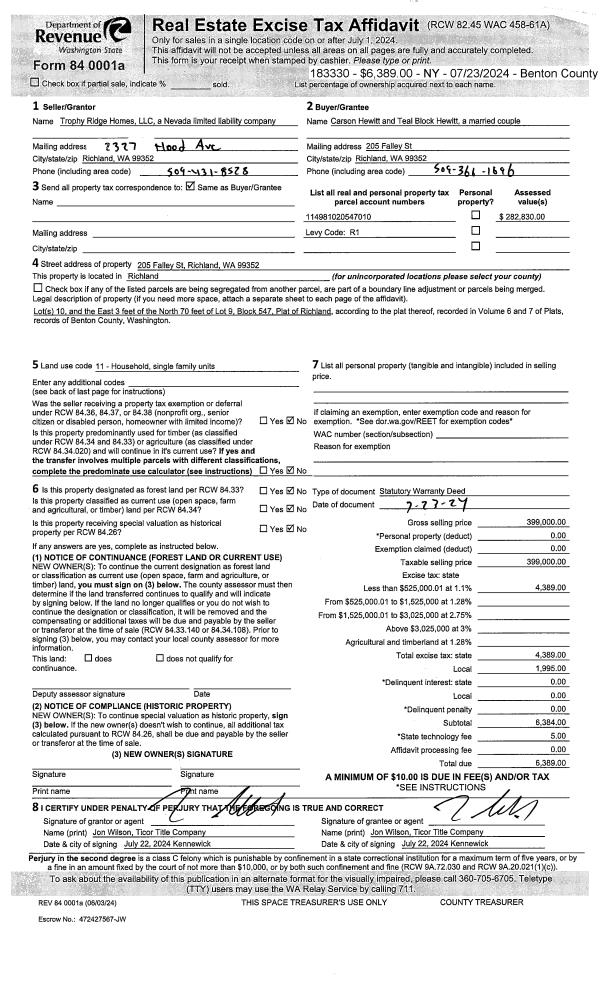 | 1 | 07/23/2024 | SWD | Statutory Warranty Deed | TROPHY RIDGE HOMES LLC | HEWITT CARSON & TEAL BLOCK | 2024-015352 | | $399,000.00 | 183330 | |
