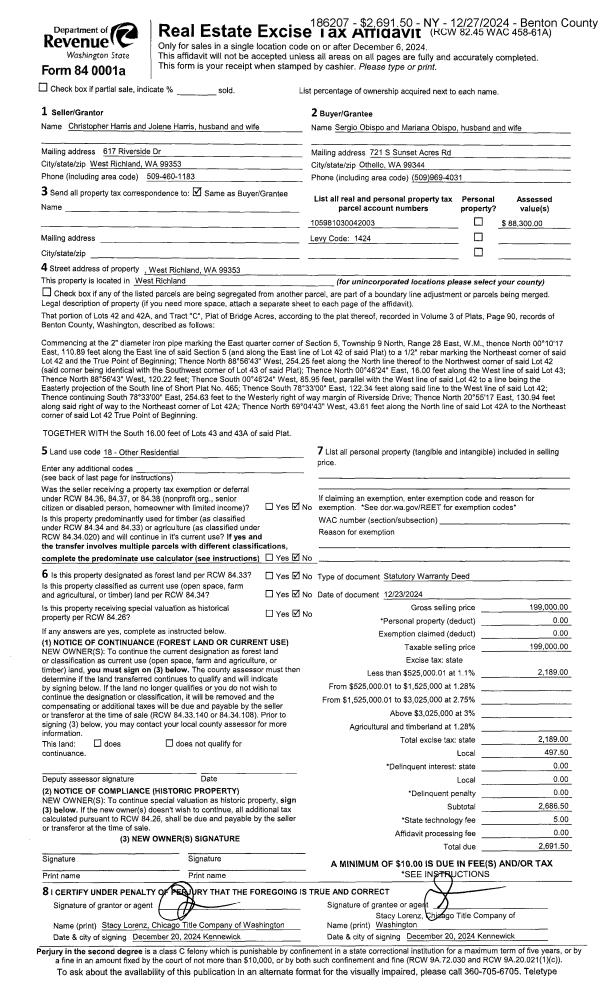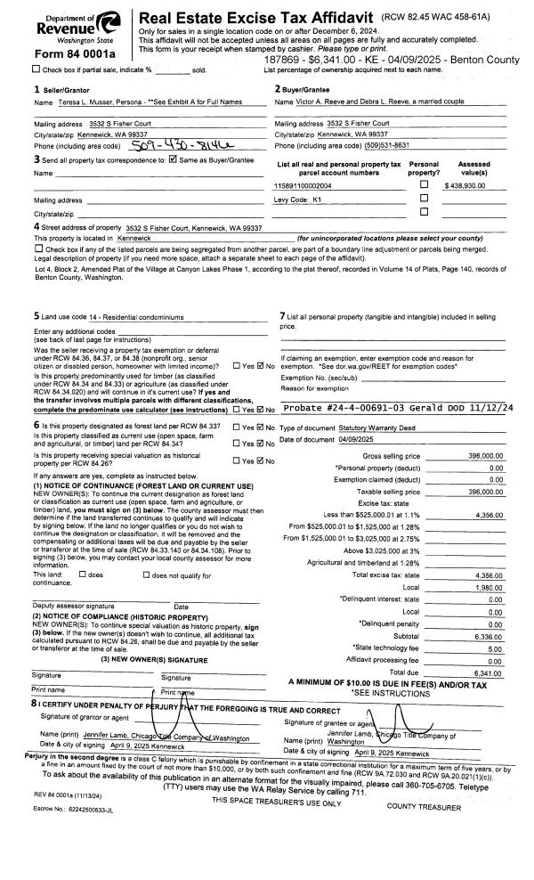 | 1 | 04/09/2025 | SWD | Statutory Warranty Deed | VANZUYEN GERALD W & MARJORIE A | REEVE VICTOR A & DEBRA L | 2025-007582 | | $396,000.00 | 187869 | |