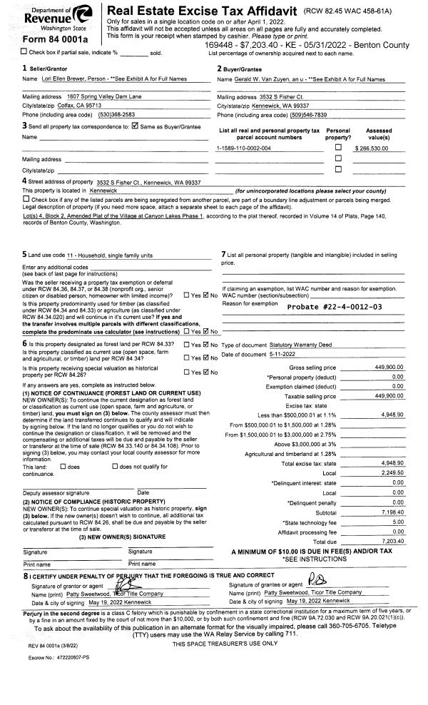 | 2 | 05/11/2022 | SWD | Statutory Warranty Deed | CARR GARY D | VANZUYEN GERALD W & MARJORIE A | 2022-018355 | | $449,900.00 | 169448 | |