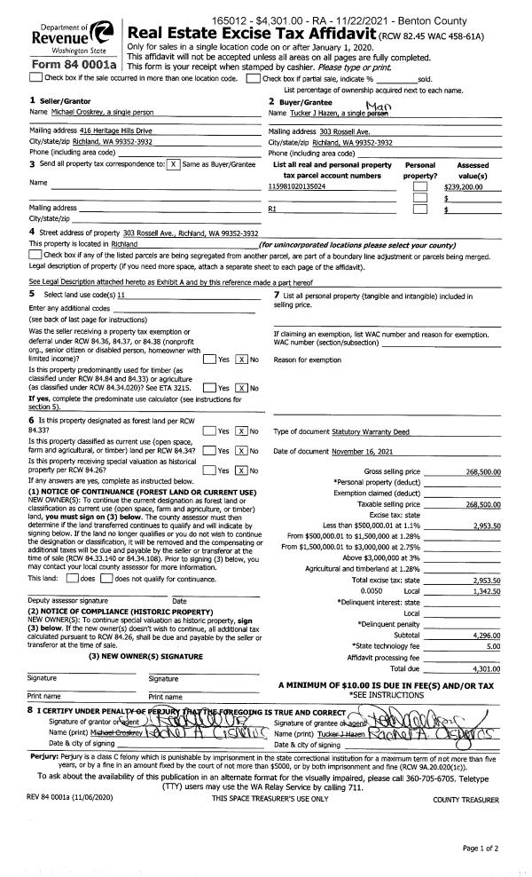 | 3 | 11/16/2021 | SWD | Statutory Warranty Deed | CROSKREY MICHAEL | HAZEN TUCKER J | 2021-053098 | | $268,500.00 | 165012 | |