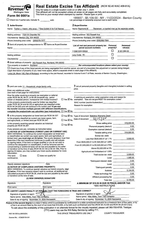 | 2 | 11/15/2024 | SWD | Statutory Warranty Deed | HAZEN TUCKER J | STENERSEN RAYMOND M | 2024-025950 | | $319,000.00 | 185657 | |