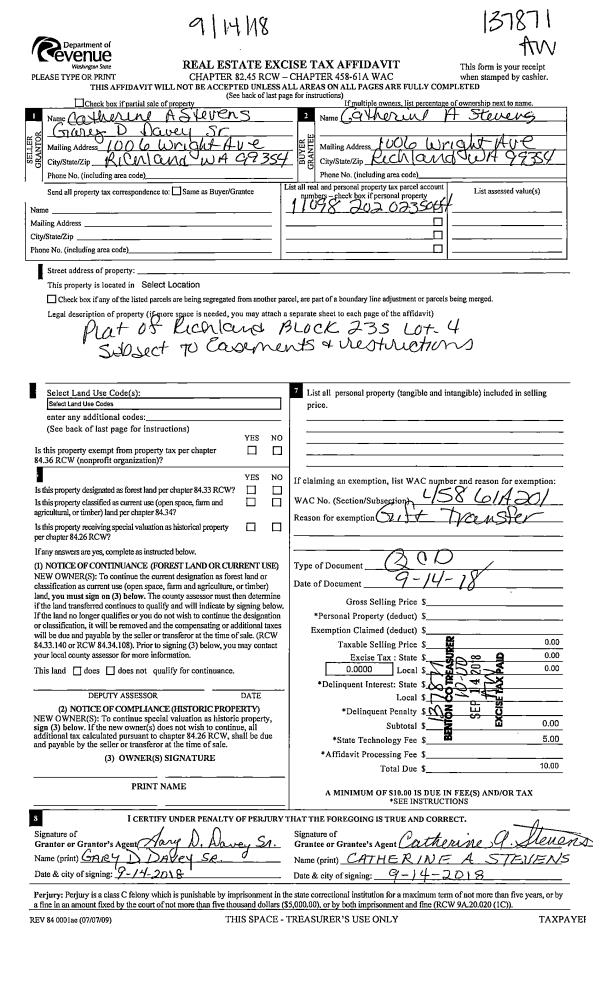 | 4 | 09/14/2018 | SWD | Statutory Warranty Deed | RICHLAND 132 LLC | HAYDEN HOMES LLC | 2018-027593 | | $820,500.00 | 137893 | |